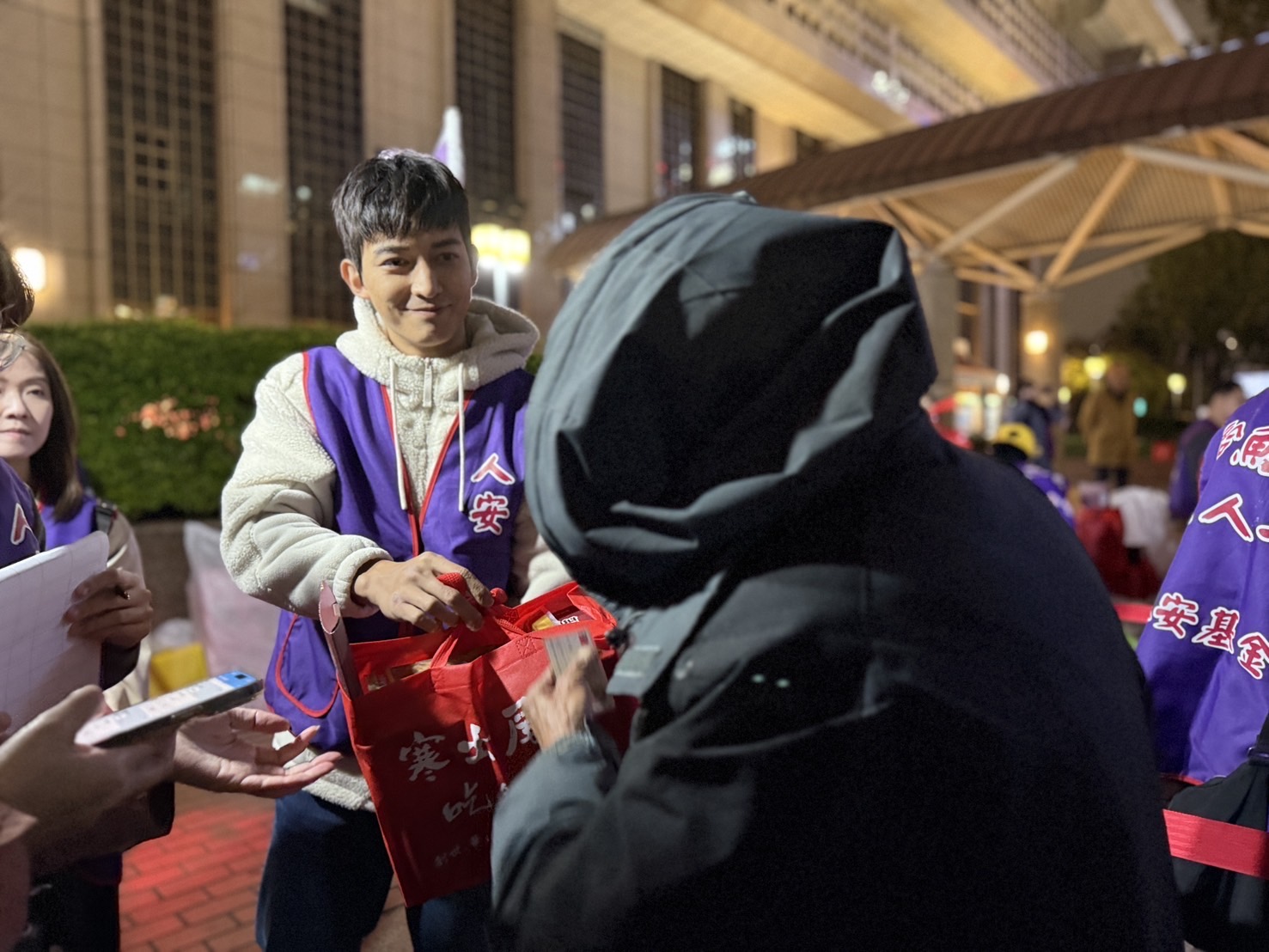 當天晚間9點,藝人王家梁走進台北車站周邊夜色當中,與人安基金會義工並肩夜訪送禮,將愛心年禮與應急紅包雙手遞向寒士。黑夜中的一聲問候、一份關懷,如同立春前的微光,在最寒冷的冬末時,點亮新年的希望。