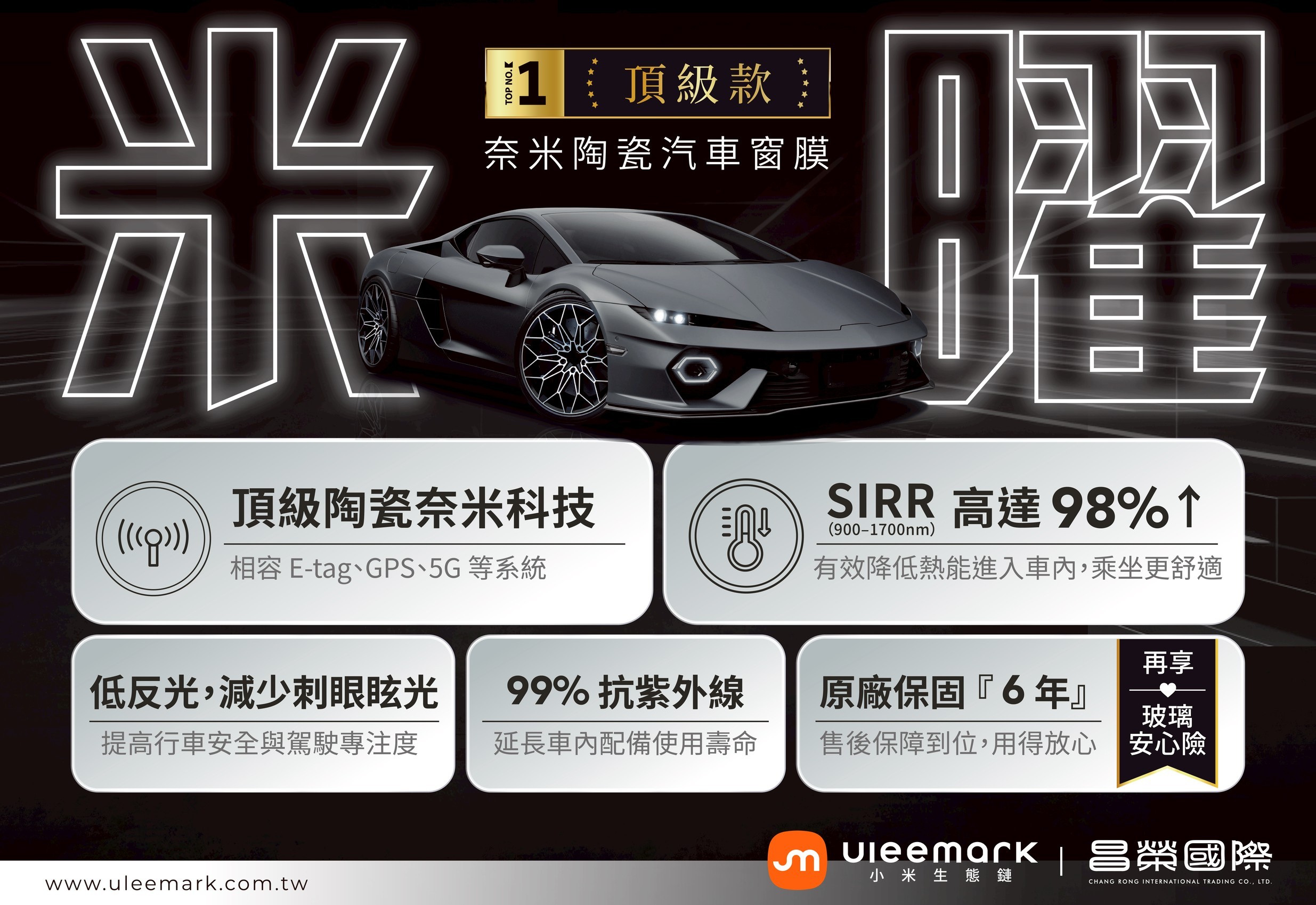昌榮國際貿易股份有限公司深耕台灣多年,為 Uleemark 台灣獨家總代理,專注引進兼具品質、科技與合理價格的車膜解決方案,致力於為車主打造更舒適、安心的用車體驗。