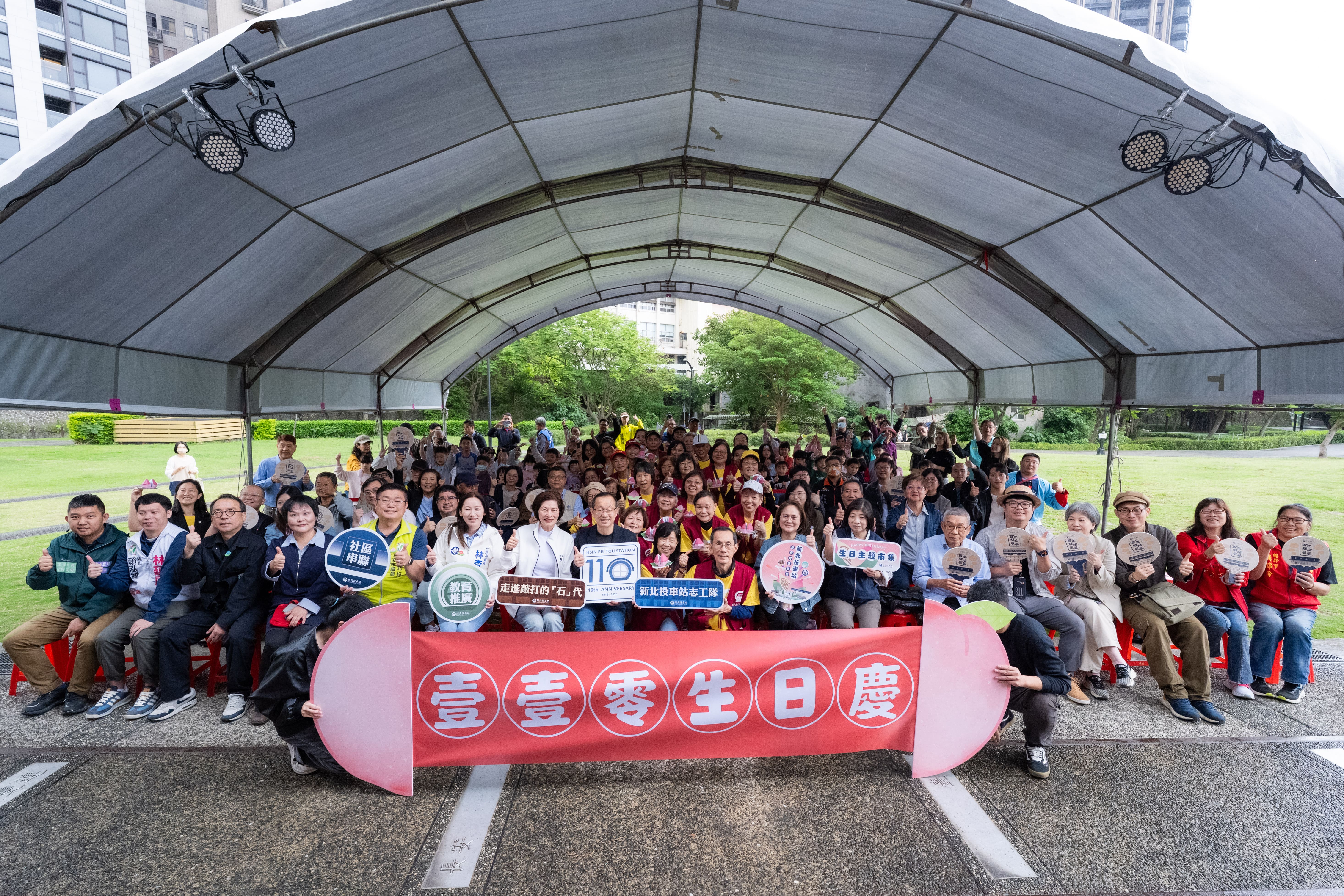 活動由北投在地民俗技藝團隊「獅頭旺劇團」揭開序幕,震撼的戰鼓與靈動的舞獅演出氣勢磅礡,表演者更與現場民眾熱烈互動,為車站慶典注入滿滿活力。隨後由北投國小學生代表向貴賓獻上象徵長壽與祝福的壽桃,不僅傳遞對車站110歲生日的祝福,也象徵世代之間對百年車站文化的傳承。活動前,北投國小學童更以畫筆描繪對車站的祝福,相關作品亦於現場展出,展現孩子們對在地文化的情感。新北投車站志工隊則以薩克斯風伴奏與演唱生日快樂歌,為車站獻上最溫馨的祝福,現場氣氛熱鬧而感人。