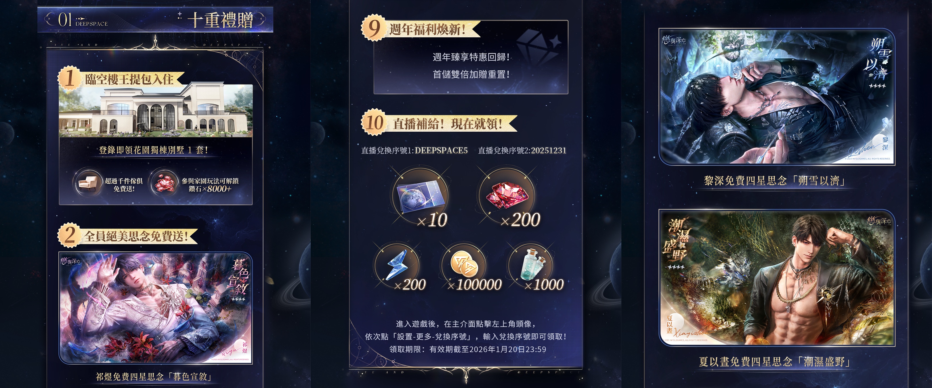 限定許願池「愛,宇宙,詩王座」開啟五星思念限時機率UP活動,獵人可從五位男主的限定五星互動思念卡「沈星回‧洄光頌」、「黎深‧辰寰律」、「祁煜‧宴神曲」、「秦徹‧混沌紀」、「夏以晝‧浴冕歌」中任選3張,所選思念許願機率限時大幅提升,占五星獲得機率的75%。活動期間,許願達到指定次數,可額外領取通用耳飾「搖曳樂章」、深空許願券‧限時×20、男主活動思念配套服飾、自選當期活動五星思念等繽紛獎勵。